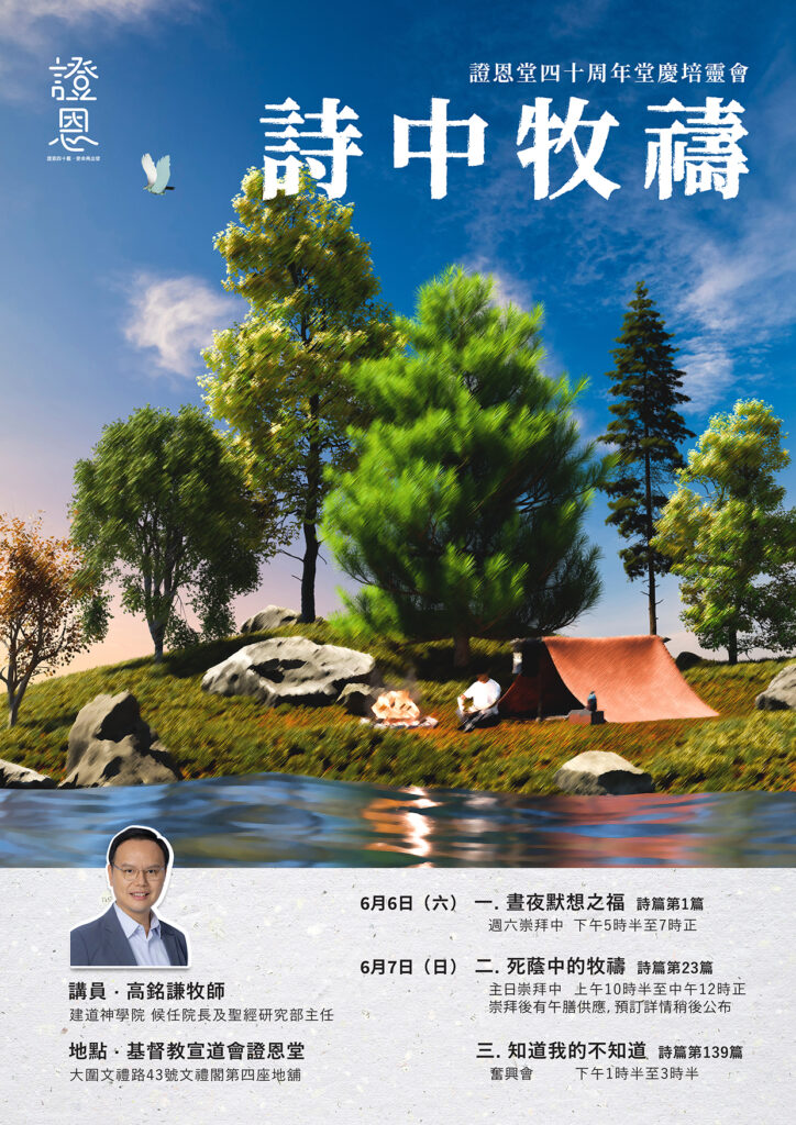 四十周年堂慶 培靈會 24/04/2026 最新消息, 本年重點, 活動消息日期:2026年6月6-7日(六、日)大會主題:詩中牧禱講員:高銘謙牧師(建道神學院候任院長及聖經研究部主任)無需報名,但座位有限,敬請提前入座! 分享至: